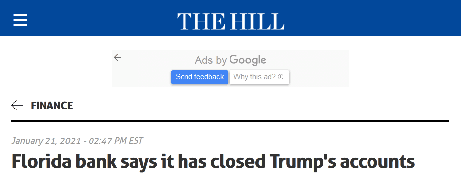 據報道,這家名為「Bank United」的銀行表示,「我們不再與他(特朗普)有任何存款(交易)關係」,但沒有給出決定關閉賬戶的原因。