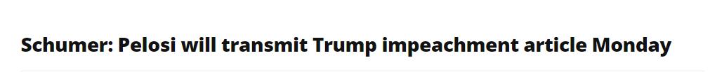 據美媒22日NBC引述美國參議院多數黨領袖舒默指,美國眾議院議長佩洛西表示特朗普彈劾議案將在星期一提交。佩洛西21日表示,不彈劾特朗普將「有害於團結」,稱前總統「不會獲得免獄免稅卡」。