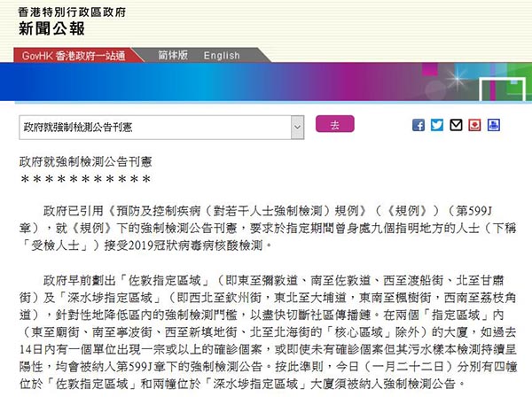 政府就強制檢測公告刊憲,要求在指定時間曾身處9幢大廈的人士,接受新型冠狀病毒檢測。