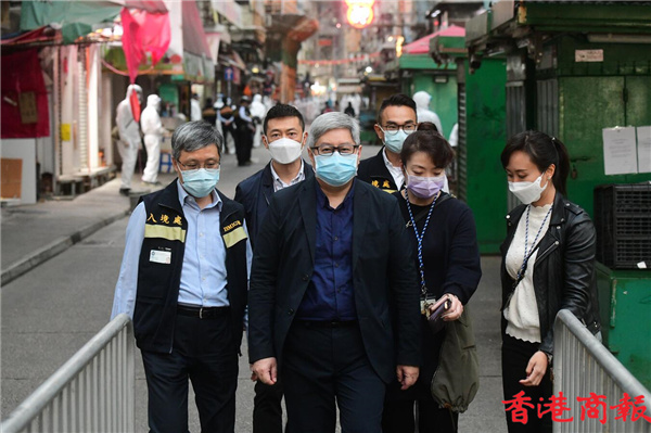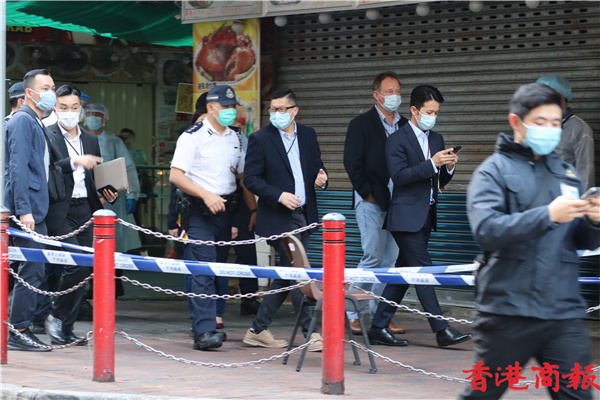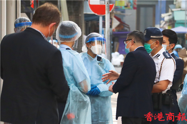 多名紀律部隊首長下午先後到政府圍封的佐敦四街範圍內視察,包括警務處處長鄧炳強、海關關長鄧以海、入境處處長區嘉宏、懲教署署長胡英明等。鄧以海視察後表示,現場有很多舊樓,實際行動不容易,要動員很多人手處理,指今次在短時間內召集人手,紀律部隊的參與是義之所在,海關亦立即調動人員參與行動,支持政府抗疫,並希望可以協助在社區中尋找到更多隱形患者。鄧以海又指,今次幾個紀律部隊合作得非常好,溝通充足,劃分區域各自參與工作,而關員亦反映區內居民非常合作及平和,相信今次行動可以順利進行。