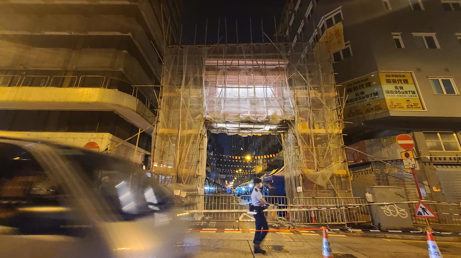 油麻地受限區域晚上情況,圖為上海街及南京街交界,街上只得政府工作人員,行人絕跡。(記者崔俊良攝)
