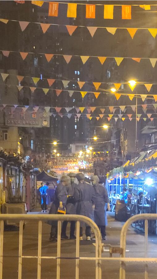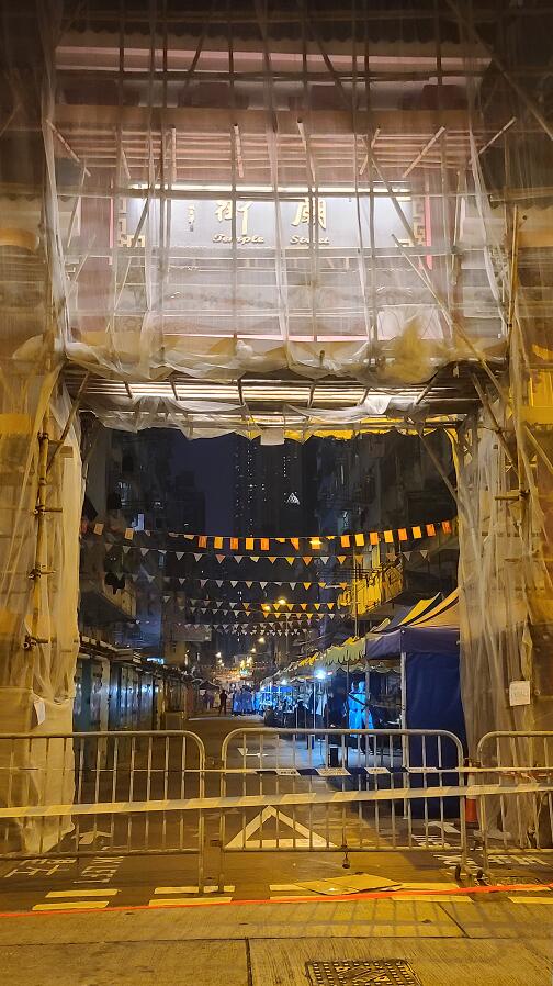 昔日繁華的廟街,沒有了各種的地攤,搭了很多的帳篷,變成了檢疫街