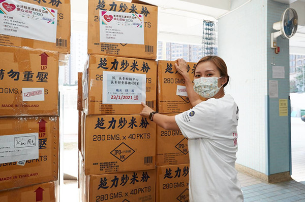 香港精英運動員協會委員趙詠賢協助包裝物資。
