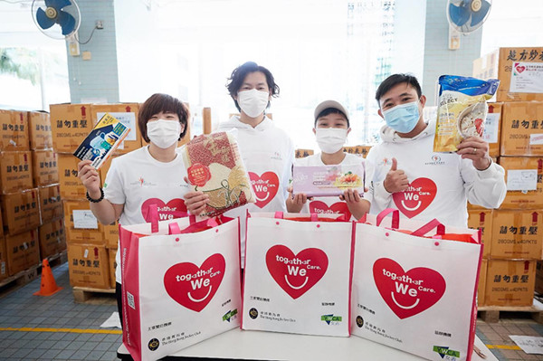 香港空手道運動員馬文心(左一)、單車運動員李燕燕(右二)、足球運動員梁金輝(左二)及蘇嘉諾(左一)等協助包裝物資。