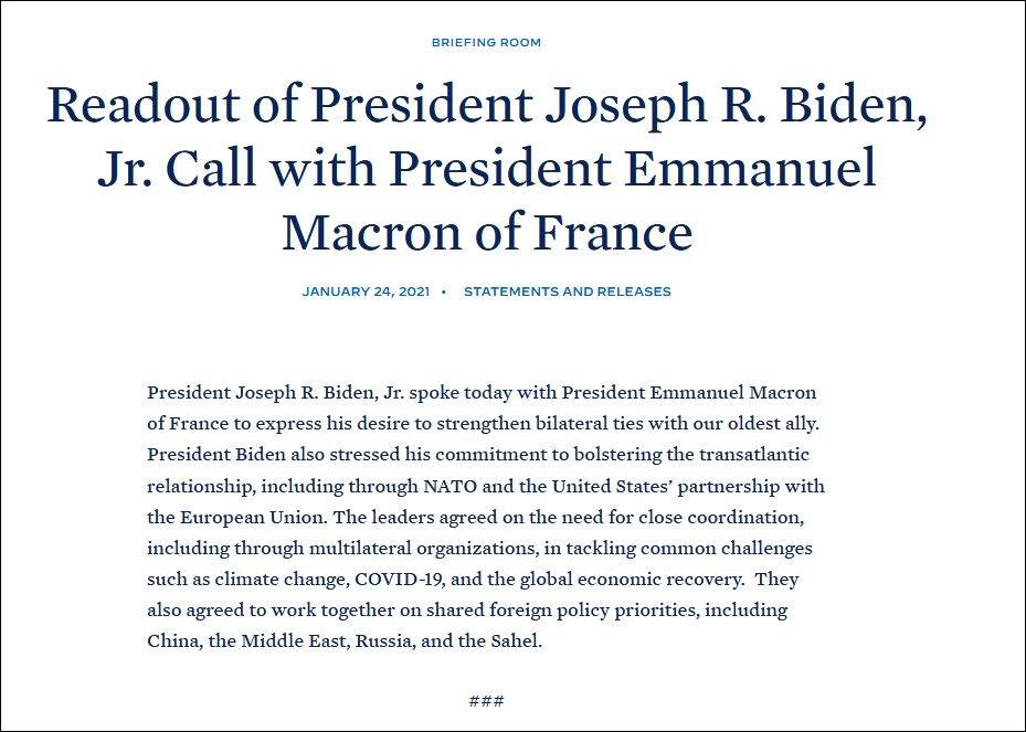 雙方就北約、氣候變化和新冠病毒疫情進行了討論。馬克龍當在電話中對美國重返巴黎氣候協定表示歡迎。白宮在聲明中也證實此事:「領導人一致認為,需要通過多邊組織等機制來應對共同的挑戰,例如氣候變化、新冠疫情和全球經濟復蘇等。」