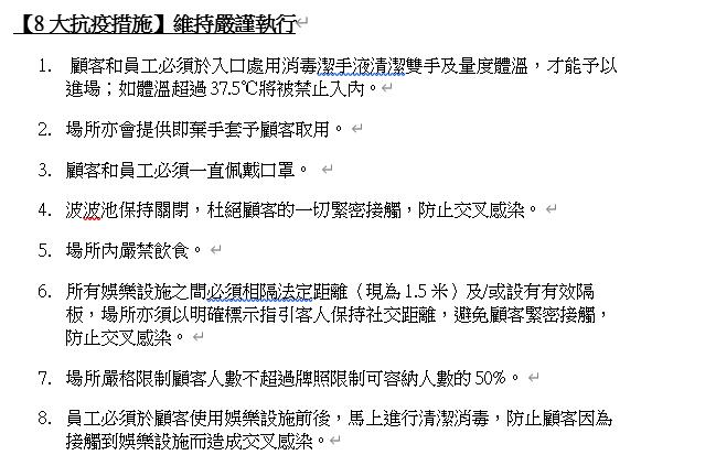 商會透露,家庭遊樂中心業界願意實施的兩項新抵疫措施是全體員工需進行新冠肺炎病毒檢測,在獲得「陰性」證明後方可工作和加強客戶使用「安心出行」流動應用程式,讓顧客進入店鋪前需要先掃瞄二維碼作紀錄後才可進入;假若客人未能下載程式,店舖會為客人登記出入紀錄,包括留下聯絡電話、居住區域等,以便有需要時協助政府作個案追蹤。