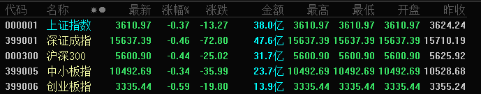 26日,A股三大指數全線低開,滬指跌0.37%,深成指跌0.46%,創業板指跌0.59%,電子煙、酒店餐飲、軍工等跌幅居前。
