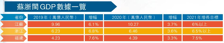 在近期密集召開的2021年地方「兩會」上,作為東部沿海發達省份,江蘇、浙江和福建三省亮出的經濟運行「成績單」雖各有特色,但抗壓應變、加速恢復成為共同點。在敲定「十四五」發展目標和重點任務的同時,三省均明確了2021年經濟發展路線圖。藉由深化改革、著力創新、加快轉型等多箭齊發,三省今年經濟預期分別高達6%、6.5%和7.5%,力圖以高質量發展為「十四五」開好局、起好步。