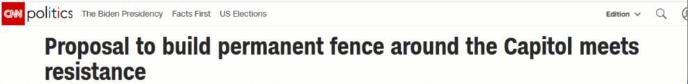 不過,鮑澤隨後寫道,「但我們不會接受增兵或永久圍欄作為華盛頓的長期固定設施」,當時機成熟時,(現有的)白宮和美國國會大廈周圍的圍欄將被拆除。
