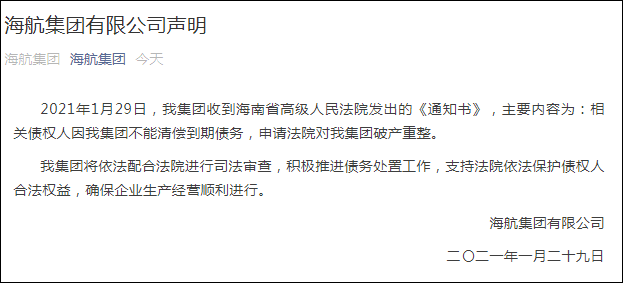 据微信公众号「 海航集团」消息,2021年1月29日,海航集团收到海南省高级人民法院发出的《通知书》,主要内容为:相关债权人因我集团不能清偿到期债务,申请法院对我集团破产重整。海航集团将依法配合法院进行司法审查,积极推进债务处置工作,支持法院依法保护债权人合法权益,确保企业生产经营顺利进行。
