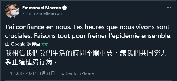 “我信任我們。我們生活的這些时刻至關重要。讓我們一起努力,減緩病毒流行的速度。”馬克龍在推特上說。