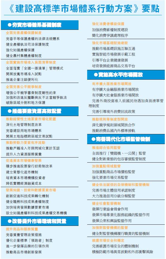 《方案》包括五個大項:夯實市場體系基礎制度、推進要素資源高效配置、改善提升市場環境和質量、實施高水平市場開放、完善現代化市場監管機制。