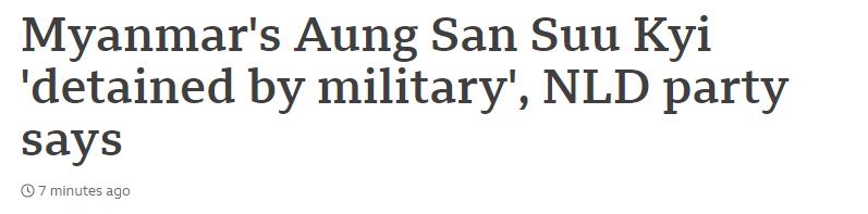 英國BBC剛剛消息,緬甸國務資政兼外長昂山素姬等政治領導人「被軍方拘留」。