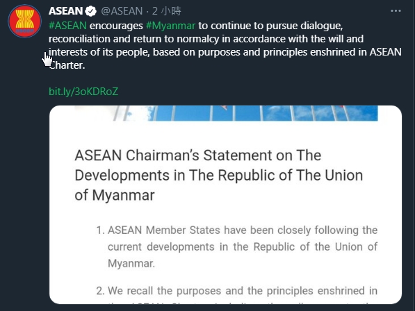 [18:40]東南亞國家聯盟(ASEAN)主席發表聲明稱,鼓勵緬甸根據《東盟憲章》所載宗旨和原則,按照其人民的意願和利益繼續對話,和解並恢復正常。
