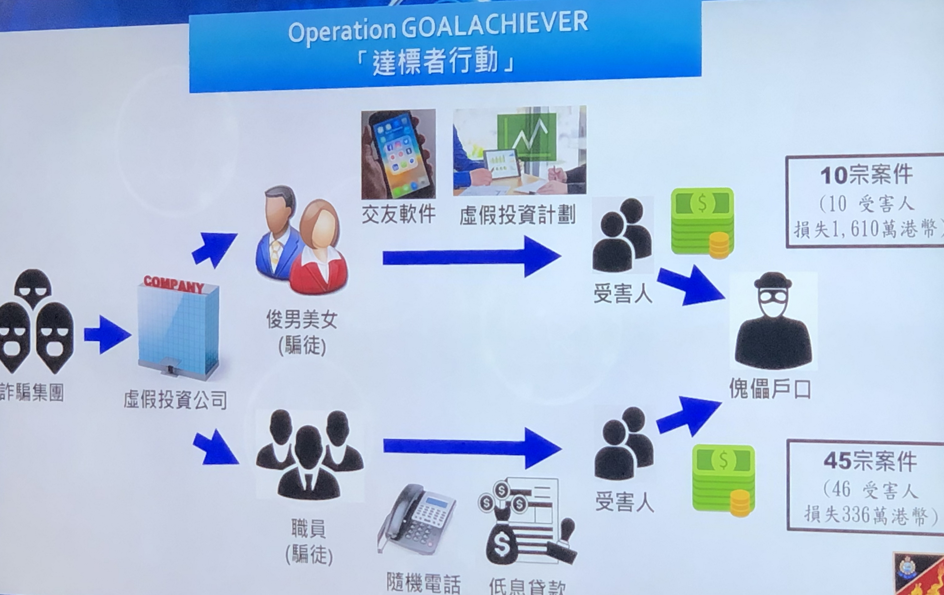 詐騙集團利用美女在手機程式尋找「獵物」,並以「心理交友攻畋」為藍本提供練習,當建立曖昧關係後游說受害人投資。商業罪案調查科經調查後,一連2日展開代號「達標者」行動,拘捕包括集團主腦和女騙徒共17人,涉嫌與10宗投資騙案及45宗低息貸款騙案,騙款約2000萬元。