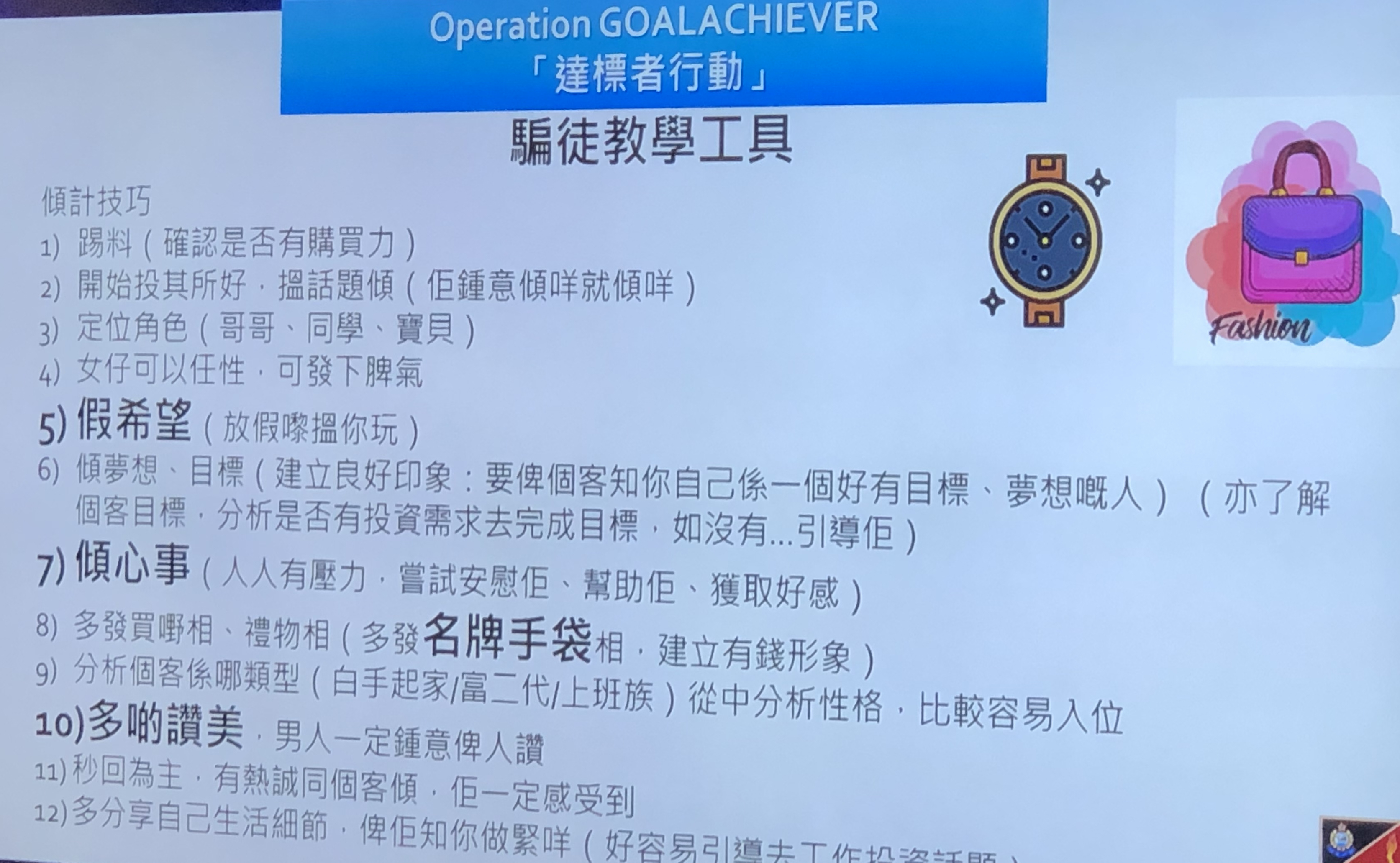 陳偉基指,在搜出的「心理交友攻略」中,會教導女騙徒接觸受害人後馬上了解其背景,以及給予假希望可以建立親密關係,稍後亦會在自己的社交網站展示名貴手袋和名車炫富,以博取受害人信任。