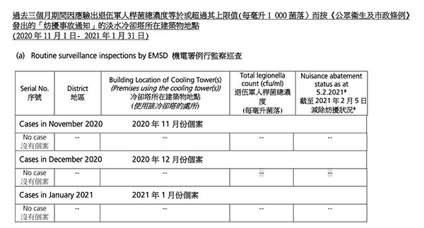機電署續公布過去3個月因退伍軍人桿菌總濃度被驗出等於或超過其上限值而收到「妨擾事故通知」之冷卻塔所位處的建築物地點,當中並沒有建築物出現上述情況,而署方指它們會每半個月定期在網頁公布最新資料,網址是www.emsd.gov.hk/tc/other_regulatory_services/cooling_towers/water_sampling/index.html。