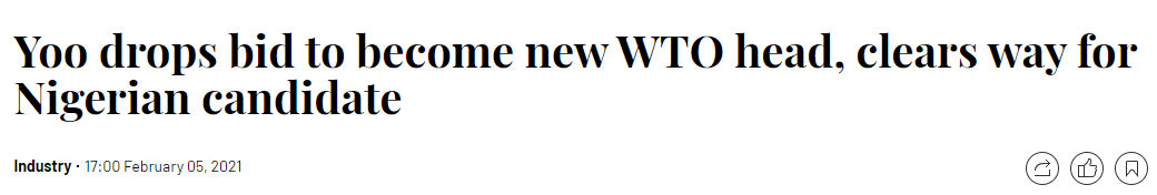 據韓聯社消息,在世界貿易組織(WTO)新任總幹事遴選最終階段,韓國候選人俞明希於5日退出遴選,為競爭對手尼日利亞候選人恩戈齊·奧孔喬-伊韋阿拉讓出道路。