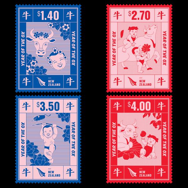 整套郵票共有四枚,採用了濃鬱的中國年畫風,明快的紅藍純色票面上有牛和娃娃形象。該郵票設計者——華人設計師徐膺敏介紹說,她的設計靈感來自兒時對中國春節傳統習俗的記憶,特別是年畫的視覺影響。