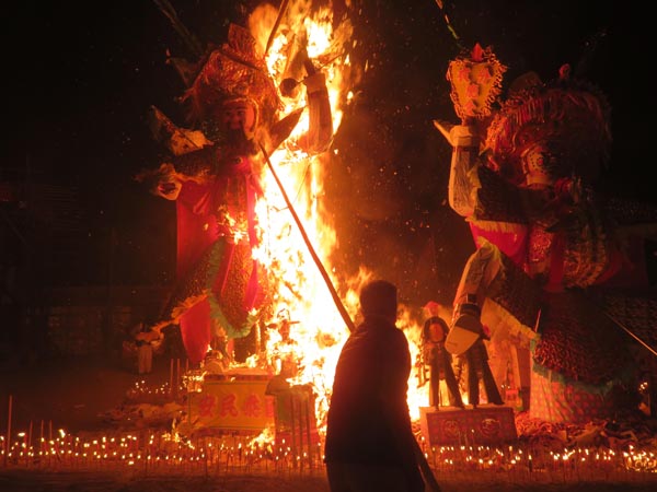 超幽散醮儀式,祭品被火化,右方為紙扎大士王,左方為護壇將軍。