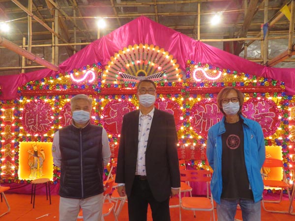 橫洲建醮委員會主席曾樹和(中)、副主席蔡建新(左)及黃永生(右)祈神恩眷香江,疫症早消除。記者鄭玉君攝