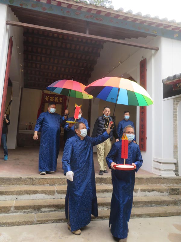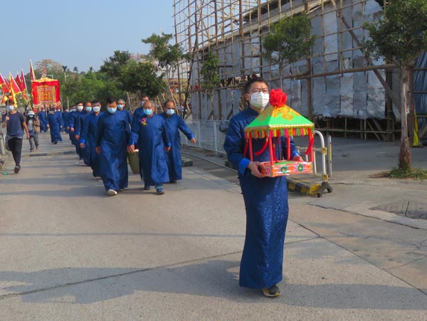 上屆行香隊伍達二千多人,由於是走路到村落進香,要花上9小時,今屆坐專車行香時間則需四句鐘。雖然相比上屆,行香不至筋疲力竭,但仍覺疲累,特別是不少緣首是中老年人。43歲的頭名緣首黃偉程較年輕,全程捧意亭,拜神一馬當先。他年屆70歲的父親黃釗廷亦有參與,黃父更因兒子要上班,請神當天自己出馬。兩人跟其他緣首一樣,參與任何儀式都很落力,黃釗廷說這是神恩賜給你做緣首,一定要做到最好。(記者 鄭玉君)