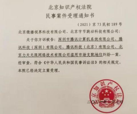 據多家內地媒體消息,7日,北京知識產權法院正式受理抖音訴騰訊壟斷糾紛案。據悉,這是自2020年底《關於平台經濟領域的反壟斷指南(徵求意見稿)》公布以來,内地首例發生在互聯網平台之間的反壟斷訴訟。