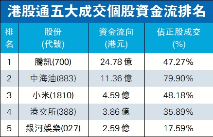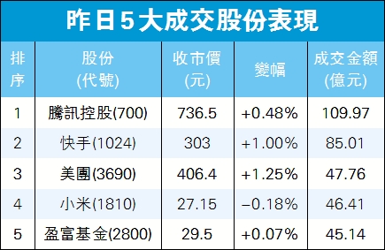 藍籌股好壞參半,股王騰訊(700)升0.5%、友邦(1299)升0.4%、港交所(388)漲0.3%、美團(3690)漲1.2%。部分重磅金融股限制大市升幅,滙控(005)連同平保(2318)齊跌0.8%、國壽(2628)軟0.5%、工行(1398)跌0.4%。