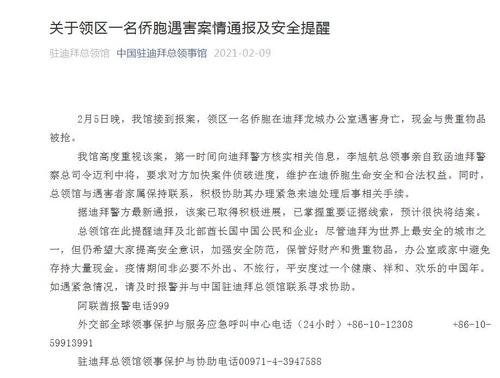 中國駐迪拜總領事館9日在其官微發布關於領區一名僑胞遇害案情通報及安全提醒。