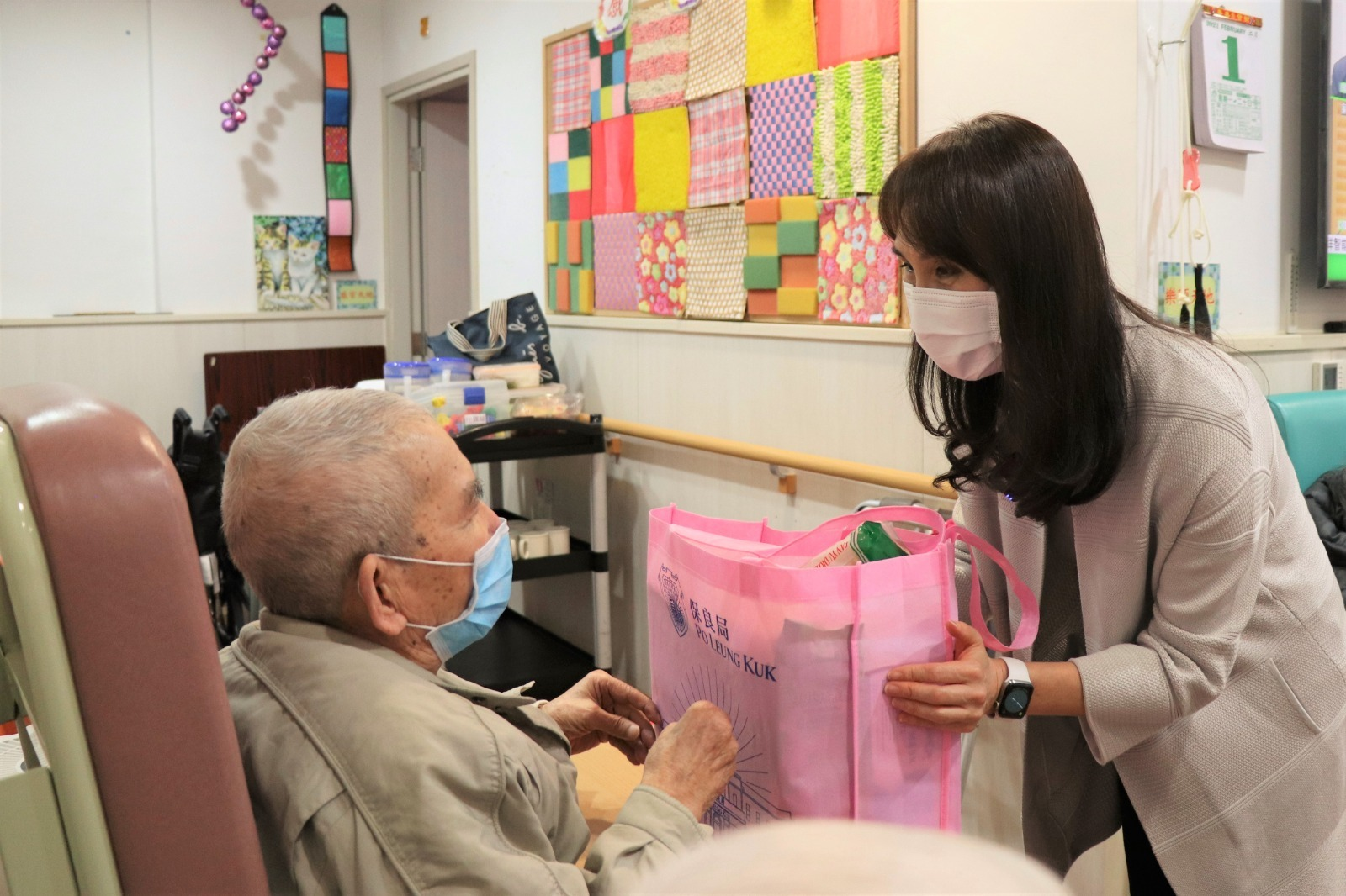 保良局主席何超鳳表示,新冠肺炎疫情下只能由自己代表保良局探訪長者日間護理中心,並親手派發賀年福袋給長者,何超鳳還祝他們身體健康、事事如意。
