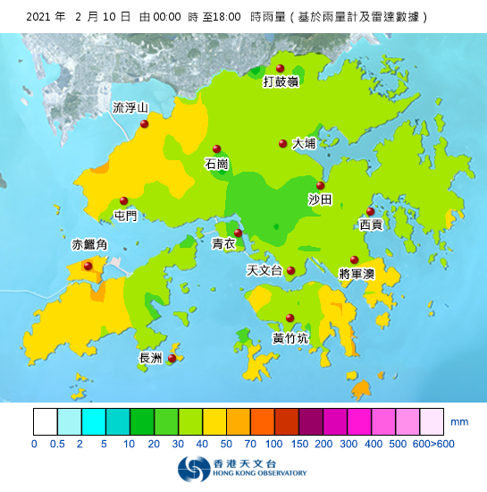 天文台表示,受到覆蓋華南沿岸的雨帶影響,本港今日多雲有雨,由午夜至傍晚6時,各區普遍錄得超過30毫米雨量。隨着雨帶逐漸遠離,預料明日除夕及農曆新年假期部分時間有陽光。
