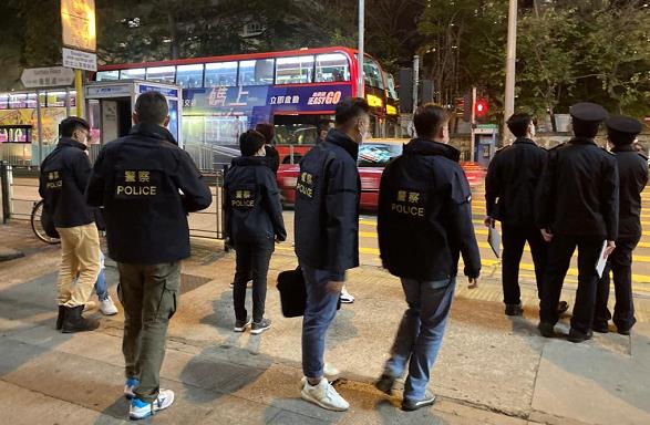 行動中,警員發現尖沙咀亞士厘道及諾士佛臺2餐飲處所內有人聚集,4男5女(23至53歲),涉嫌違反限聚令遭警員票控。