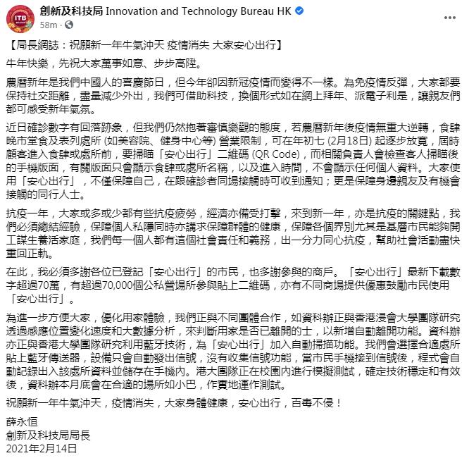 創新及科技局局長薛永恒今日(14日)在社交網站發表網誌指,「安心出行」最新下載數字超過70萬,多謝各位已登記「安心出行」的市民,也多謝參與的商戶。他又表示,當局與大學合作,研究為程式新增自動離開、自動掃描等功能。