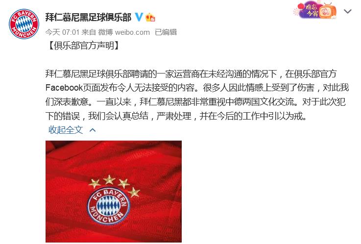拜仁14日在微博發表官方道歉聲明,指球會聘請的一間營運商在未經溝通的情況下,在球隊Facebook發布令人無法接受的內容,指很多人因此情感上受到了傷害對此深表歉意。