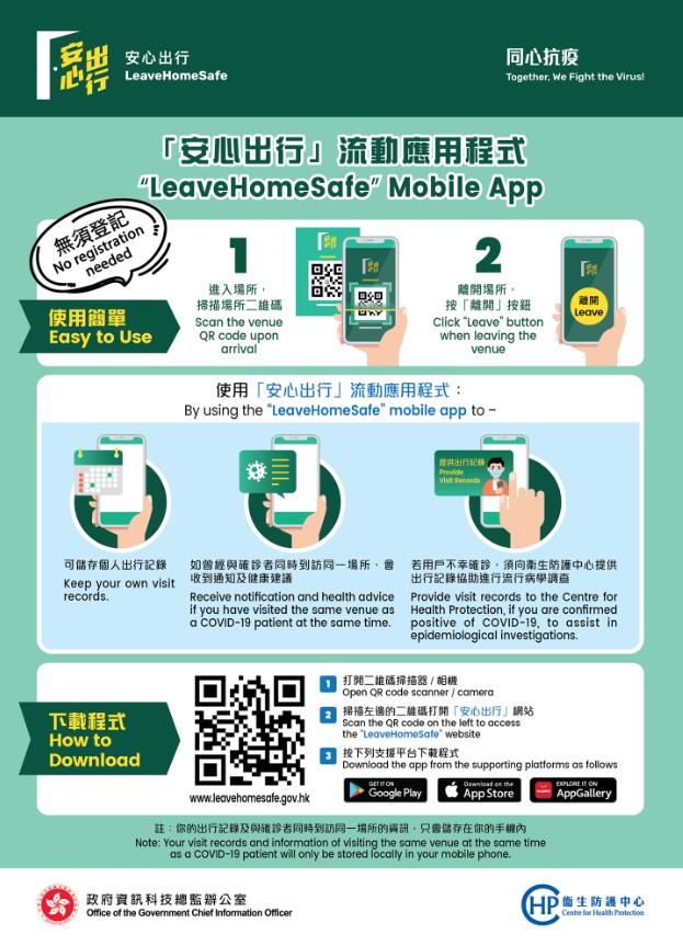 他呼籲市民盡快下載和踴躍使用,紀錄自己進出不同場所的行蹤。他指,「安心出行」流動應用程式重視市民個人私隱,用戶無須登記任何個人資料便可立即使用,出行紀錄只會加密存放於用戶自己的手機,出行紀錄的比對和提示功能亦只會在手機程式內進行,不會備存在任何政府或其他系統內,並會在31天後自動刪除,市民可以安心使用。