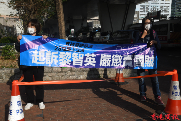 「DQ行動組」亦有成員到場,支持警方依法起訴黎智英,要求法院嚴懲黎智英。(蔡啟文攝)
