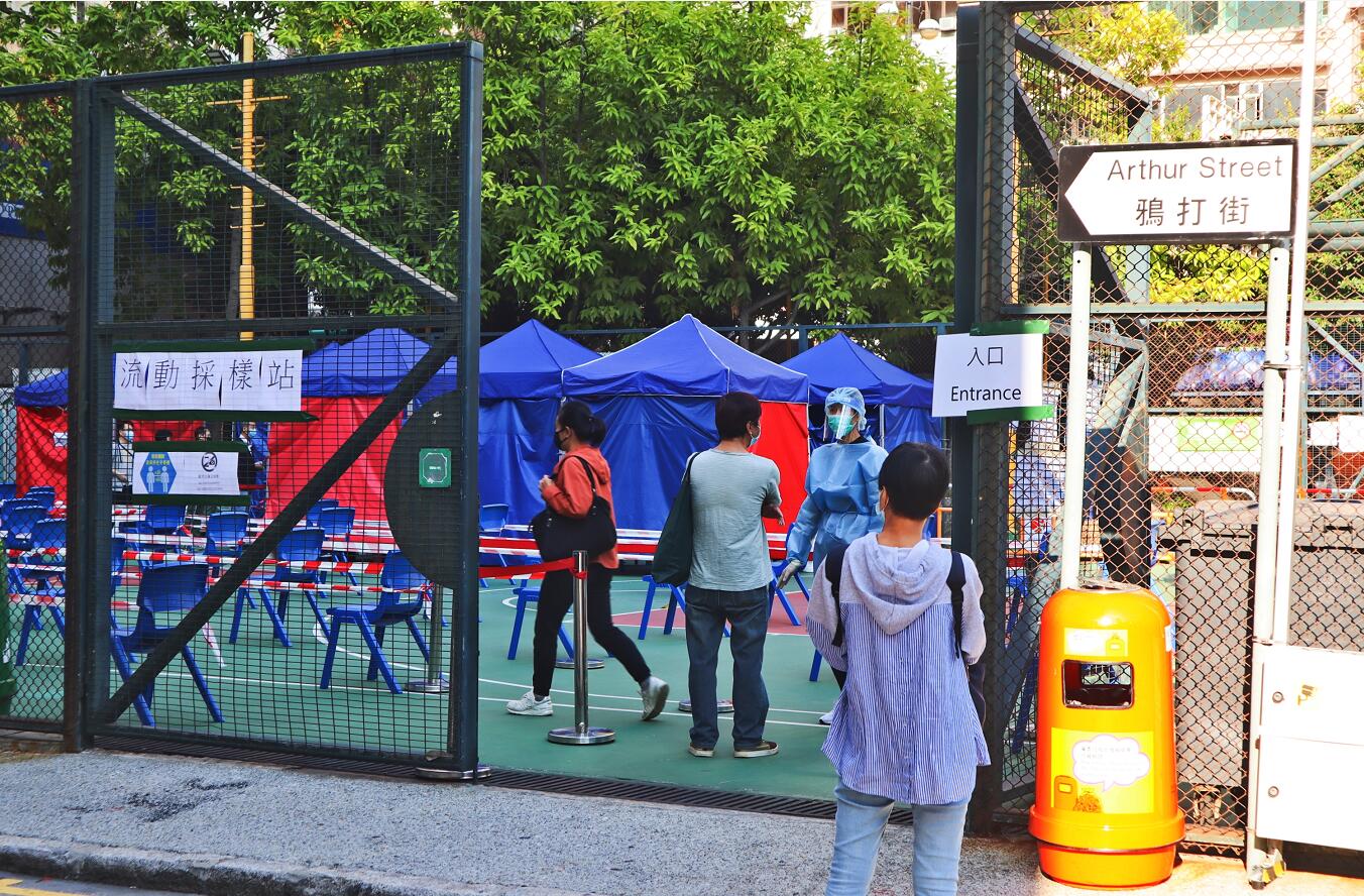 油麻地鴉打街新設立的流動採樣站,舒緩了大量市民到梁顯利油麻地社區中心做檢測的壓力。(馮瀚文攝)