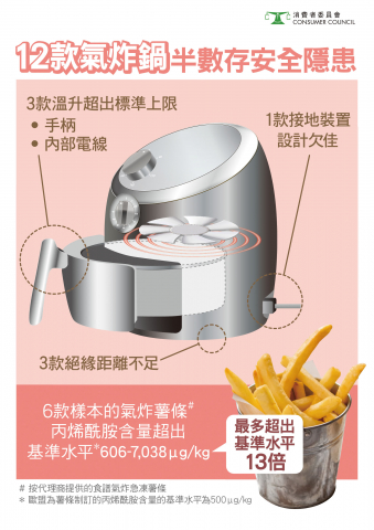 近年來,氣炸鍋因標榜可以較健康地烹飪油炸食物而備受歡迎。據本港消委會最新一期的《選擇》月刊,消委會測試了市面上12款氣炸鍋的安全及效能表現,發現半數存在不同的安全隱患,包括部件溫度升幅過高、絕緣距離不足及接地裝置欠佳。其中最低評分的樣本,欠缺牌子名稱及產品型號標示,除了不符合法例要求,亦無足夠資訊聯絡代理或生產商跟進。