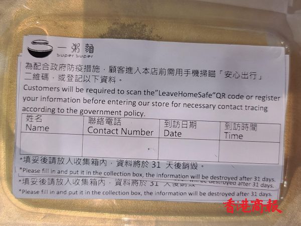 今天已見到不少食肆在門口貼有「安心出行」的二維碼,以及相關的說明。同時旁邊也放有相關的表格,以供沒有智能手機的人士填寫相關的健康資料,上面必須填寫姓名,聯絡電話,到訪時間和日期,然後放入旁邊的收集箱。