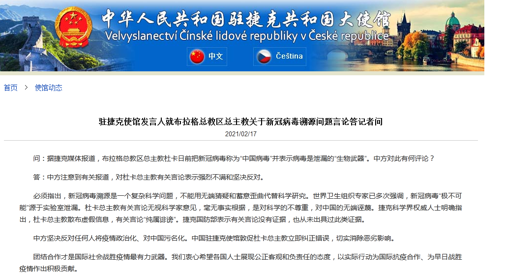 中方堅決反對任何人將疫情政治化、對中國污名化。中國駐捷克使館敦促杜卡總主教立即糾正錯誤,切實消除惡劣影響。