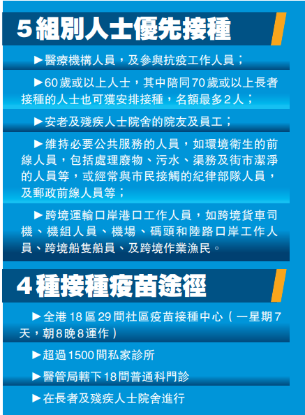 70歲以上長者最多可有2人陪同,帮助到郵局或屋邨辦事處上網预约;居住在安老院人士,政府會安排外展團隊到場接種,會先安排10間大院舍接種,之後再推展到其他院舍。市民接種後可獲紙本針卡,亦可到「智方便」下載電子針卡。接種計劃開始後,會留意疫苗供應,考慮擴展為16至59歲有長期健康問題的人士,隨後為60歲以下的其他人士安排接種。