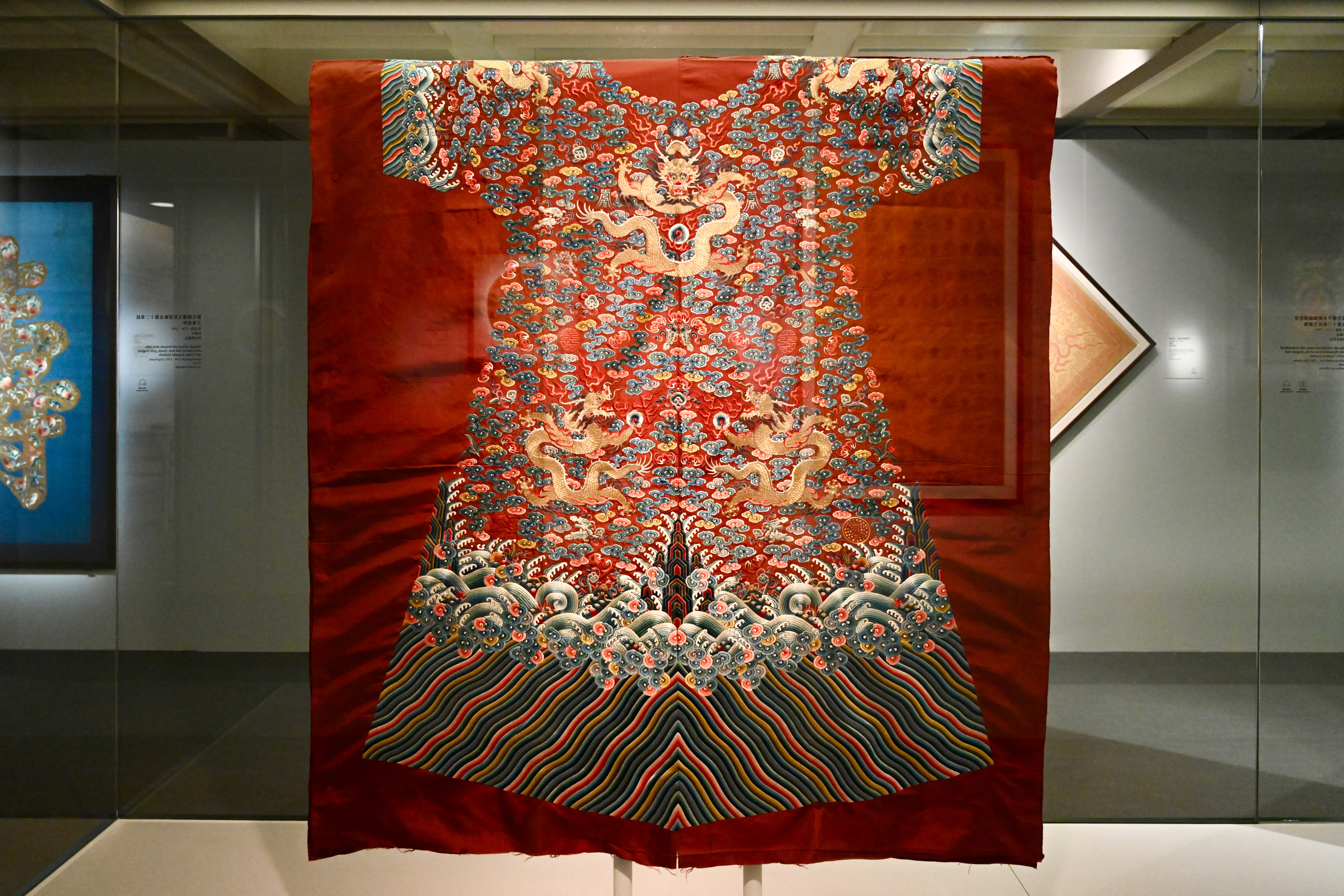 香港藝術館明日(19日)起舉行「聚道傳承──敏求精舍六十周年」展覽。圖為清代乾隆時期的醬色綢繡五彩雲蝠金龍十二章紋吉服袍料。(昇雯閣藏品)