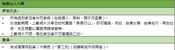 綠色力量透露,「綠色力量環島行」今年繼續推行「無痕行山」,是次活動還加設了「無痕山人大獎」,以鼓勵參加者多實踐。市民可於旅程開始前參考綠色力量編制的港島徑生態遊蹤指南及了解無痕行山7大原則,例如妥善處理廢物、減低用火、不要騷擾或傷害野生動物等。綠色力量希望市民由日常習慣開始多做一步,改變郊遊時的態度和行為,以保護珍貴的郊野環境。