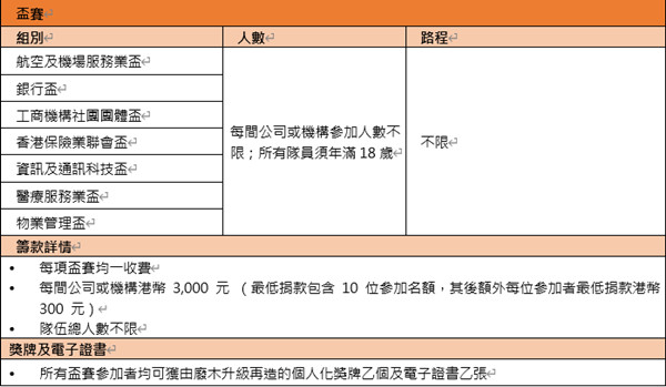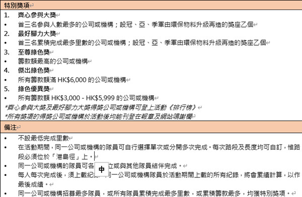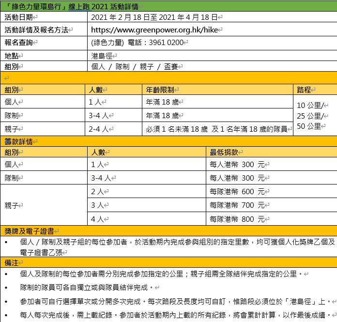 綠色力量表示,「綠色力量環島行」線上跑亦設有7個企業盃賽,而每項盃賽均設有5大獎項,包括齊心參與大獎、最好腳力大獎、至尊綠色獎、傑出綠色獎及綠色優異獎,獎項是鼓勵企業團隊組隊挑戰,而活動不但可為環保出一分力,還有助加強團隊間的合作精神。
