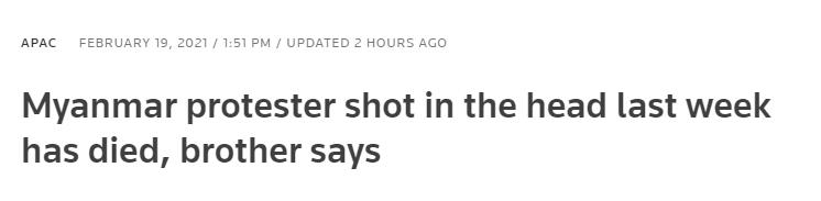 據路透社今日(19日)消息,緬甸一名年輕女性抗議者Mya Thweh Thweh Khine的哥哥說,上周五,警方試圖驅散示威人群時,該女子頭部中彈,送院後不治身亡。