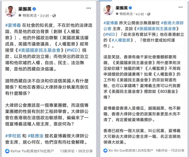香港大律師公會主席夏博義近日公開表示無意辭職,聲稱雖然接受「美國國家民主基金會」(NED)捐款,但NED從來沒有嘗試干預「人權監察」。全國政協副主席、前特首梁振英今日(21日)於社交平台批評夏博義的說法是笑話,反問若「人權監察」工作與NED宗旨背道而馳,是否可以申請撥款。