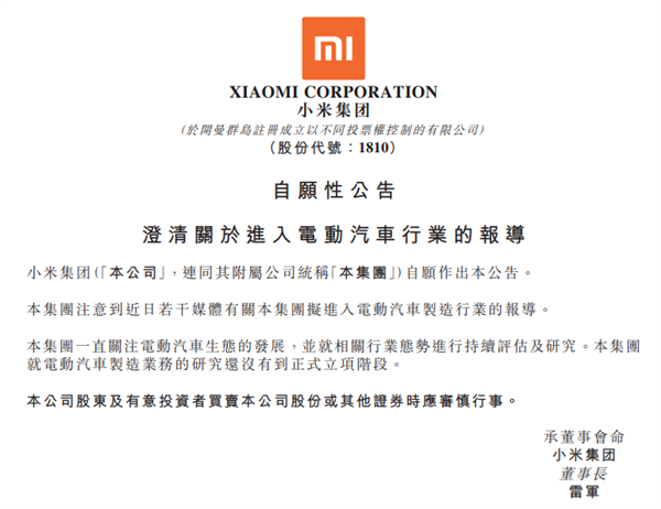 21日晚,小米集團在港交所發布公告,回應造車傳聞。小米在公告中表示,注意到近日若干媒體有關本集團擬進入電動汽車製造行業的報道。本集團一直關注電動汽車生態的發展,並就相關行業態勢進行持續評估及研究。本集團就電動汽車製造業務的研究還沒有到正式立項階段。