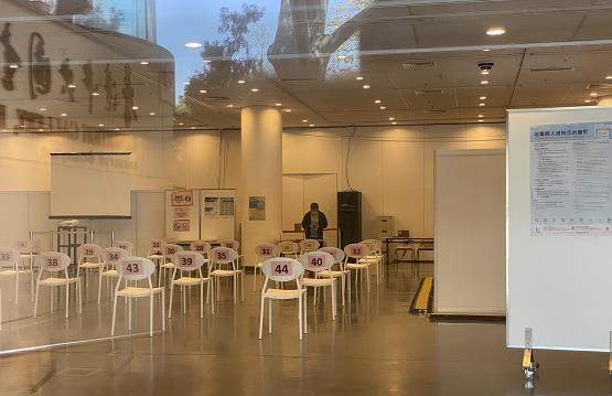 國產科興疫苗首批100萬劑抵港,行政長官林鄭月娥聯同多位司局長,今日(22日)下午2點半在設於銅鑼灣中央圖書館社區疫苗接種中心,接種科興新冠疫苗。記者剛才所見,工人正於門外貼上標示;而接種中心內的資訊區亦放置多排座椅,座椅間均有一定距離。(記者 梁希賢攝)