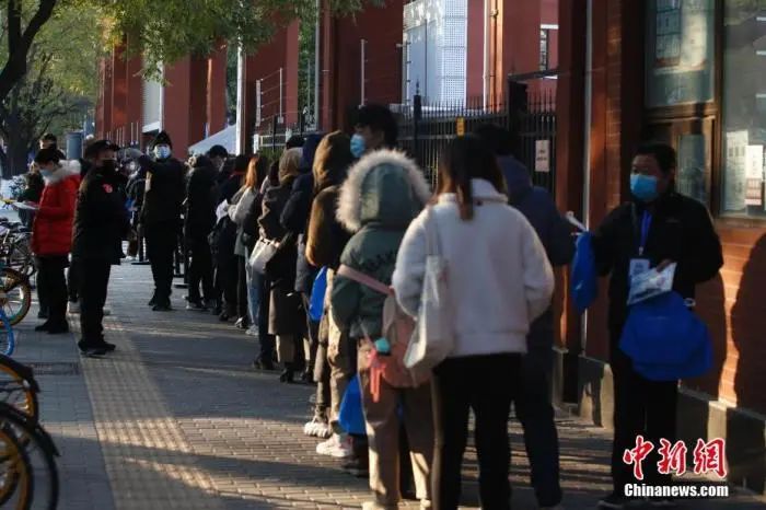 2020年11月29日,北京市東城區一處國考考點外,考生排隊等候入場。 中新社