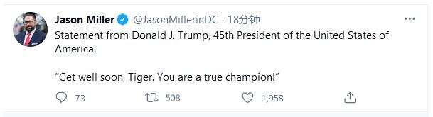 事故發生之後,作為資深高爾夫愛好者的美國前總統特朗普,第一時間通過發言人在推特上發表聲明,「快好起來,『老虎』。你是真正的冠軍!」